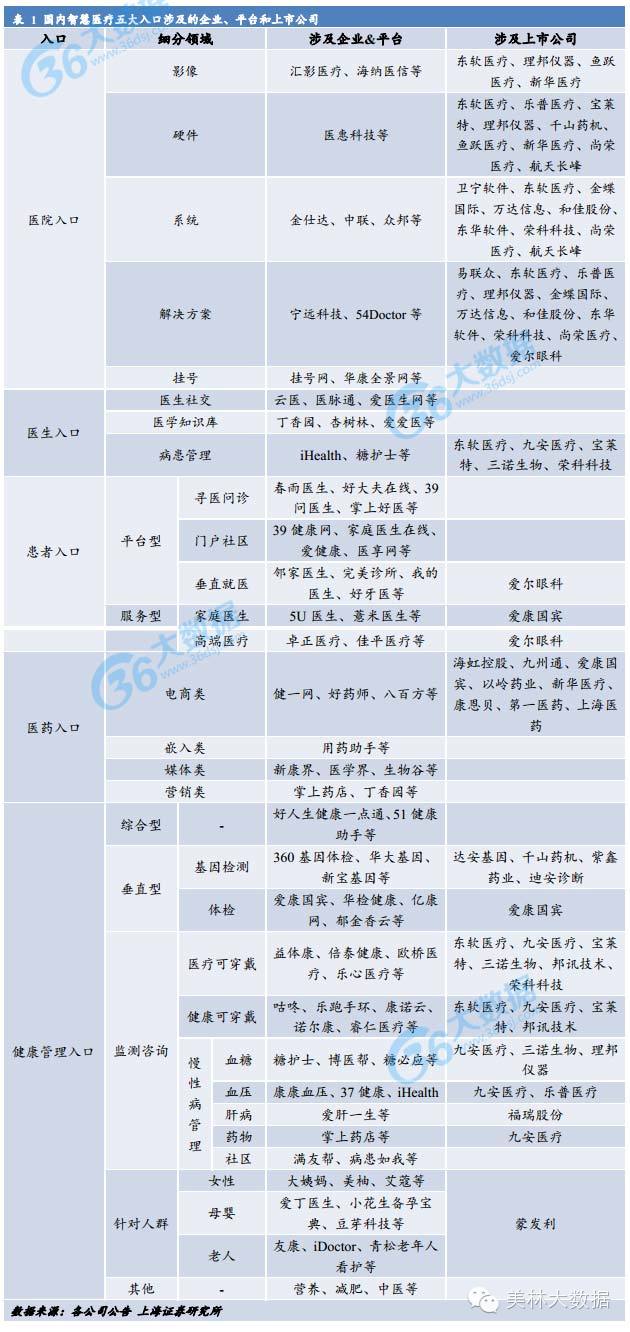 移动互联网与某些行业的结合应用其实是一个跨界整合的手段,智慧医疗行业体现的更为明显。这是一个横跨了诸多个行业,包括医疗服务、医疗器械、生物及医药、健康管理、 TMT(科技/媒体/通信)等,就目前与互联网医疗结合的较多的可穿戴智能设备,它与医疗健康、智能硬件、移动互联网、大数据、云计算等都有关系。跨界整合的能力对于智慧医疗企业把握发展先机快速切入市场尤为重要。 我们认为, 智慧医疗主要有五大入口,分别为医院入口、医生入口、患者入口、医药入口和健康管理入口。 根据这五大入口,我们将涉及的企业及上市公司整理成表 1。